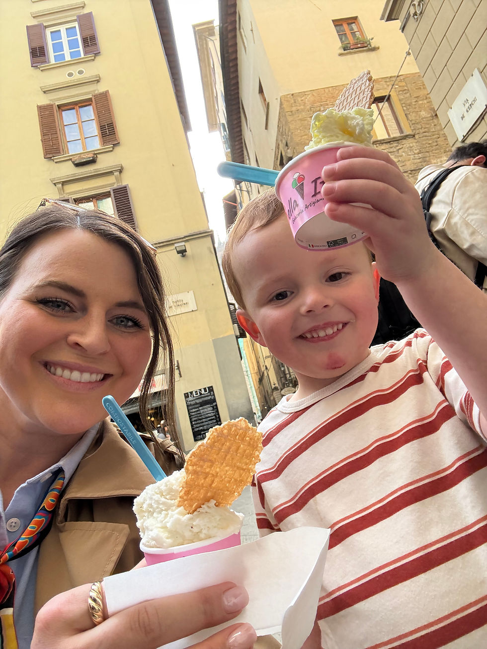 At this point, I’m truly so shocked at how great the kids are doing. We finished our lunch and decided to walk back towards our apartment through Piazza Della Signoria where Silas had fun looking at the fountains and chasing pigeons. We finally came across a gelato shop and had to stop - Silas was so happy he was finally getting “Italy ice cream” (and so was I)!