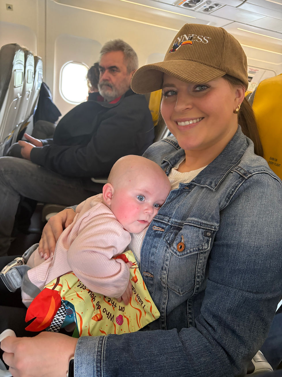 We have time to grab some coffee and muffins before we have to board a shuttle to go to the flight. We are on the shuttle over 10 minutes as our departure time comes and goes. Finally, a gate agent escorts us all off the shuttle due to issues with the aircraft. We wait around for about an hour before they fix it, we get BACK on the stupid shuttle and board our flight. We gate-checked our Doona stroller but were worried we wouldn’t be able to get it before our second flight so I made sure I had the baby carrier on the plane with me.